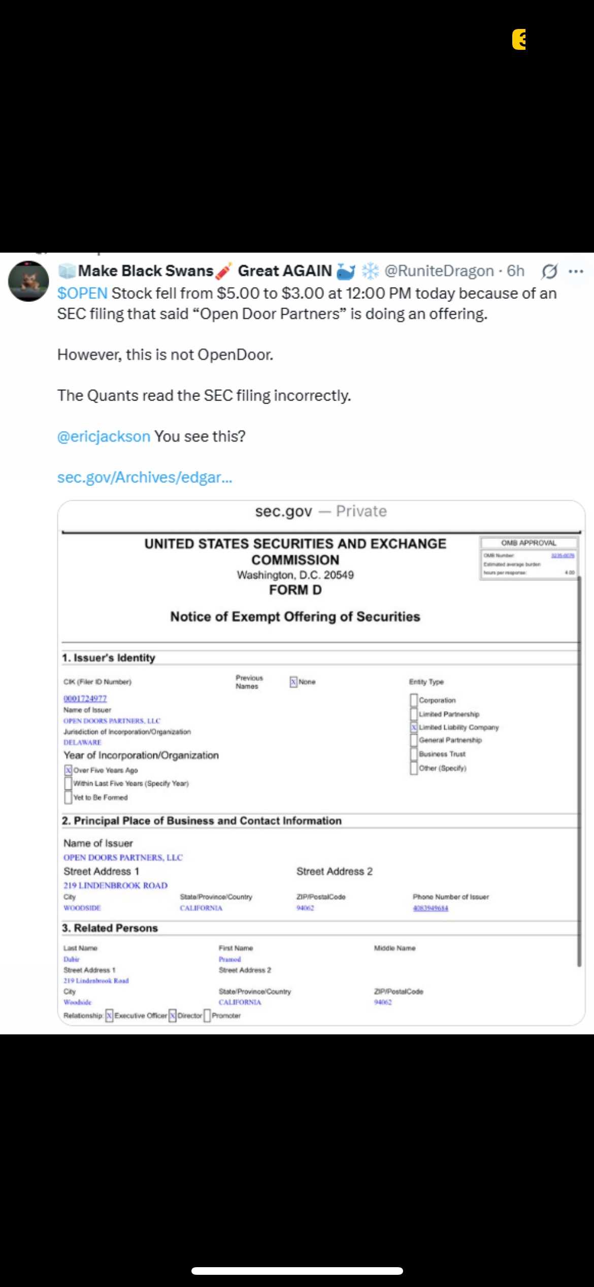 i found out the real reason open dumped from 5-3. A company with a similar name did a offering. the quants ( bot traders ) read this as Opendoor technologies instead of open door partners, which was the real stock doing the offering. This caused many positions to be dumped and everyone else then sold driving the price lower. So what we saw today was not a pump and dump, but simply a misunderstanding. This proves the stock still has momentum and will defiantly fly when the market opens.
