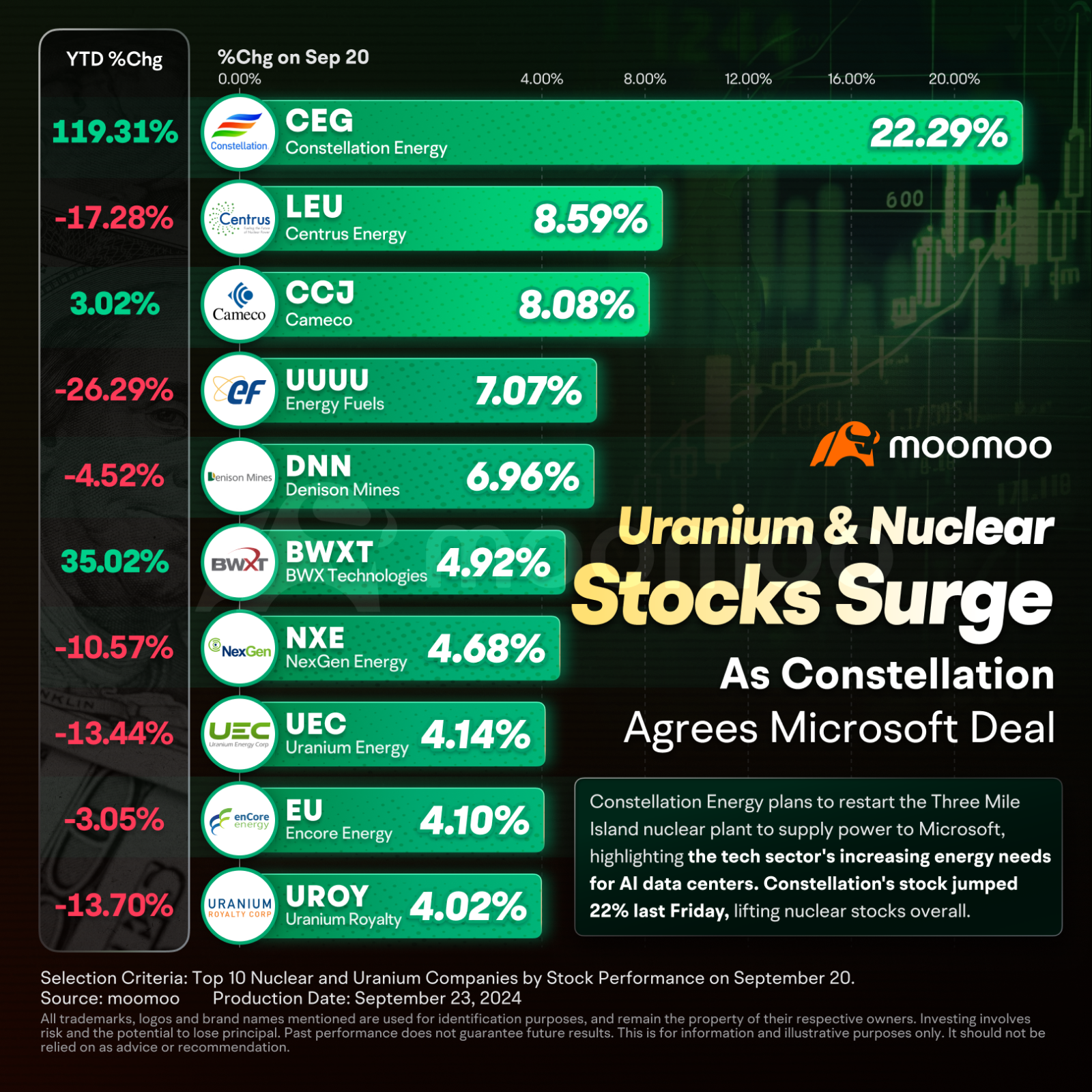 This move underscores the significant demand for nuclear energy from tech giants in the AI era. Following the announcement, Constellation's stock soared by 22% last Friday, pushing its year-to-date gains over 119%, while other uranium and nuclear stocks also experienced a varied uptick.