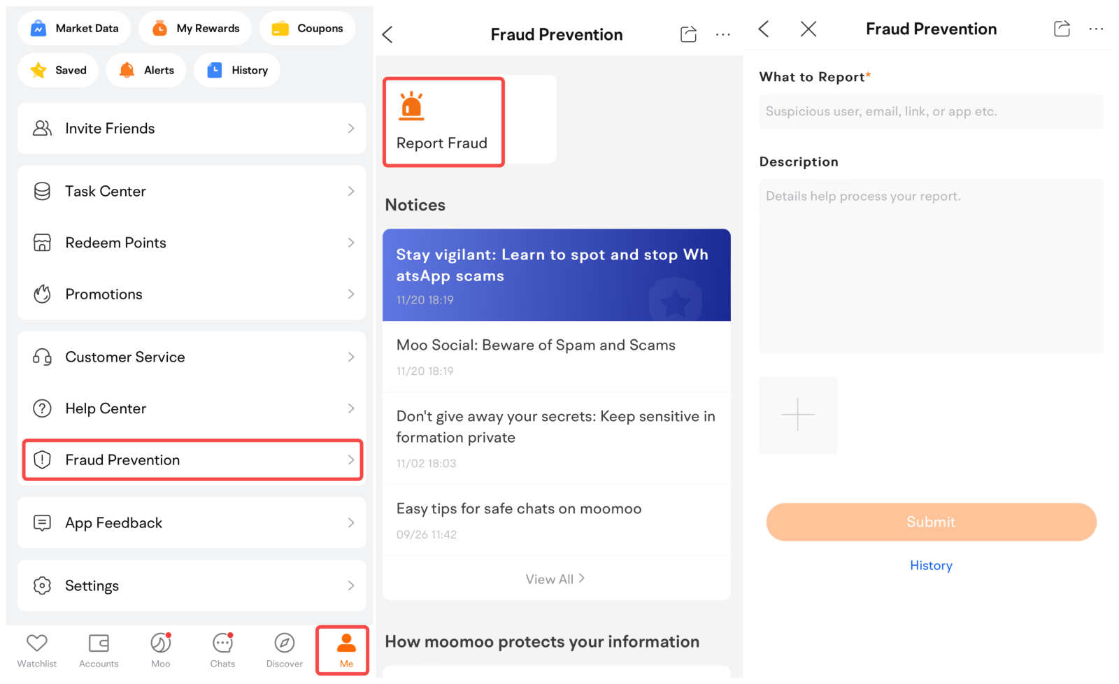 如果您遇到可疑活动,您可以通过访问“我的-反欺诈-报告欺诈”来报告它们。该功能适用于Moo社区内外的问题。我们鼓励您报告任何未经授权的通信,例如冒充moomoo的电话或信息,以及以我们名义提供非法股票推荐的行为。我 > 反欺诈 > 报告欺诈该功能适用于Moo社区内外的问题。我们鼓励您报告任何未经授权的通信,例如冒充moomoo的电话或信息,以及以我们名义提供非法股票推荐的行为。