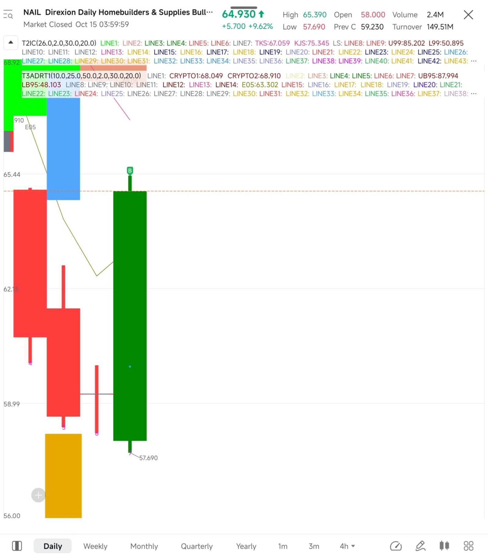 $Direxion每日房屋建筑商与供应牛市3倍做多股票 (NAIL.US)$ 昨天一根绿色K线吞没了三根红色K线。在我的自定义指标上,显示出了趋势反转。这只股票在美联储降息声明后下跌,这是过去几个月典型的“买谣言卖新闻”案例。