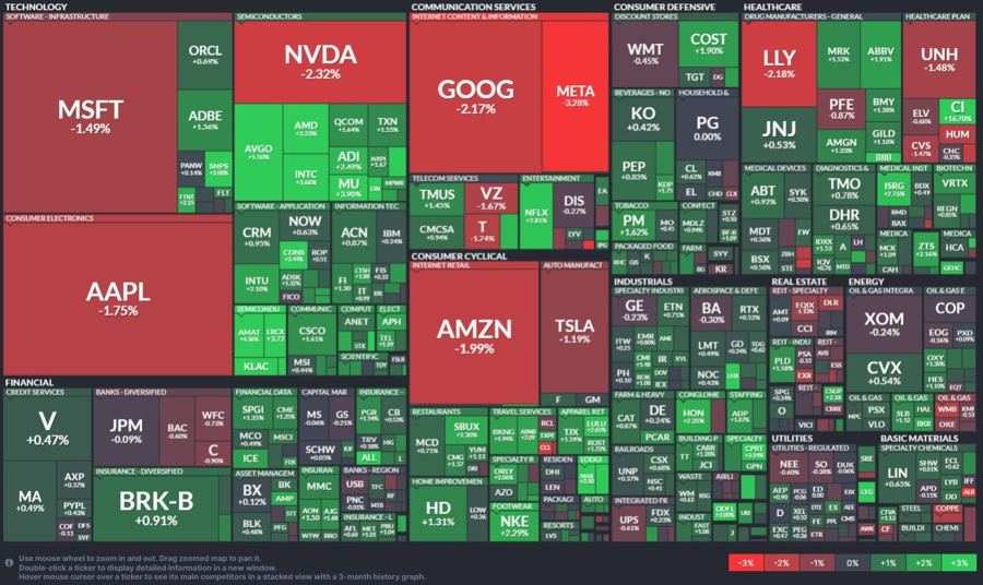 META(Meta Platforms, Inc.)受到特别关注,其在热图上的深红色方块可能预示着分销和获利回吐的持续趋势。色彩的强度表明投资者越来越谨慎,如果目前的趋势保持不变,他们可能会进一步下跌。这可能象征着投资者更广泛的情绪,这些投资者在过去一年中从这些大型股中获得了可观的回报,现在他们希望在不确定时期之前锁定利润并减少风险敞口。