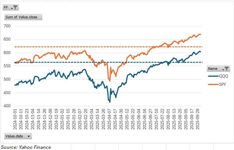 • 如果我现在不兑现任何利润,SPY/QQQ需要下跌约7%(SPY:669 → 624,QQQ:605 → 565,大致回到6月之前的水平),我的投资组合才会开始受到明显损失。