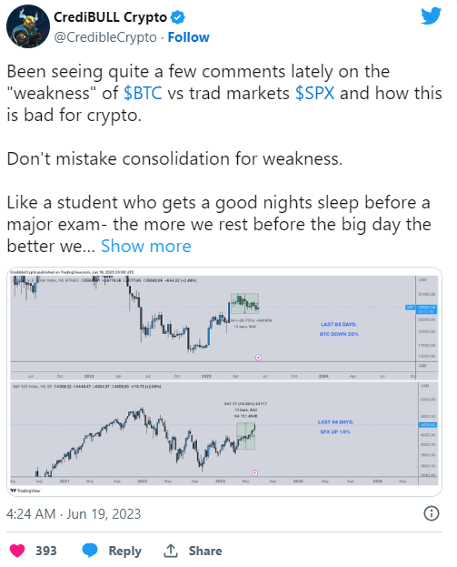 可靠的加密貨幣表明,最近 BTC 和 SPX 表現之間的差異(橫向與各種消息來源稱為「牛市反彈」)之間的差異仍可能會解決為多頭市的利益。
