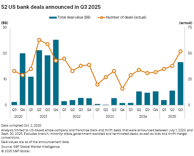 投行業務復甦:一個突出的主題是 美國銀行業併購活動的反彈,2025年第三季度宣佈了52筆交易。—這是自2021年第三季度(59筆)以來的最高季度記錄。根據標普全球市場情報截至9月30日的數據,交易總價值攀升至166.3億美元,爲自2021年第四季度(252.6億美元)以來的最高水平。這一復甦得益於更清晰的監管環境、企業信心的增強以及進一步減息的預期,推動了諮詢和承銷收入的增長。首次公開募股(IPO)也迎來了自2021年末以來最強勁的一個季度,進一步增添了動力。分析師指出,儘管週期正在獲得動能,但全面的「史詩級繁榮」尚未實現,且與關稅相關的阻礙仍需謹慎對待。
