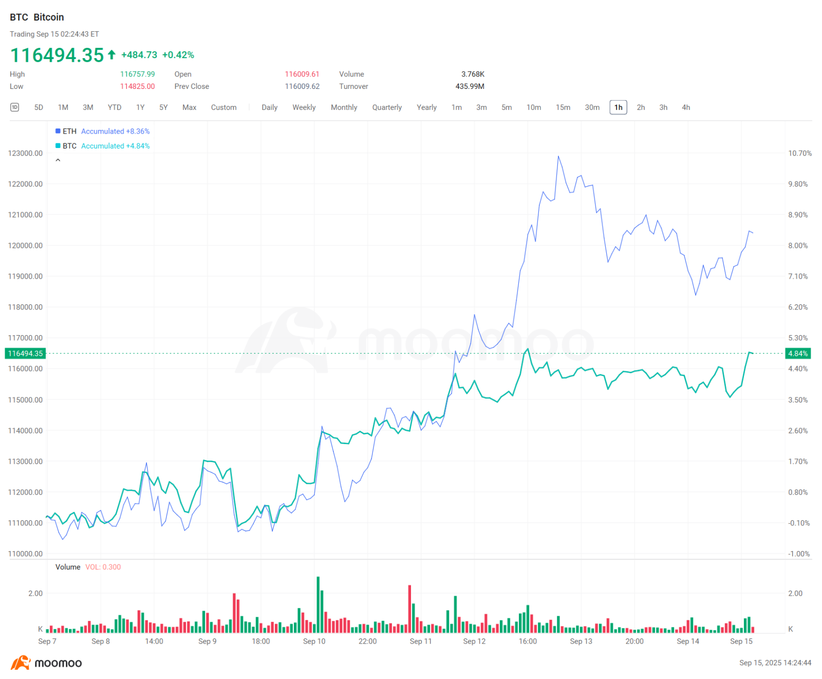本週,加密貨幣市場呈現出波動上行的趨勢。截至目前, $比特幣 (BTC.CC)$ 價格在116,000美元上方盤整,周漲幅接近5%。 $以太幣 (ETH.CC)$ 已反彈至4,600美元關口,周內漲幅超過8%。此外, $Solana (SOL.CC)$ 和 $幣安幣 (BNB.CC)$ 的市值均創下歷史新高,雙雙突破1,300億美元。