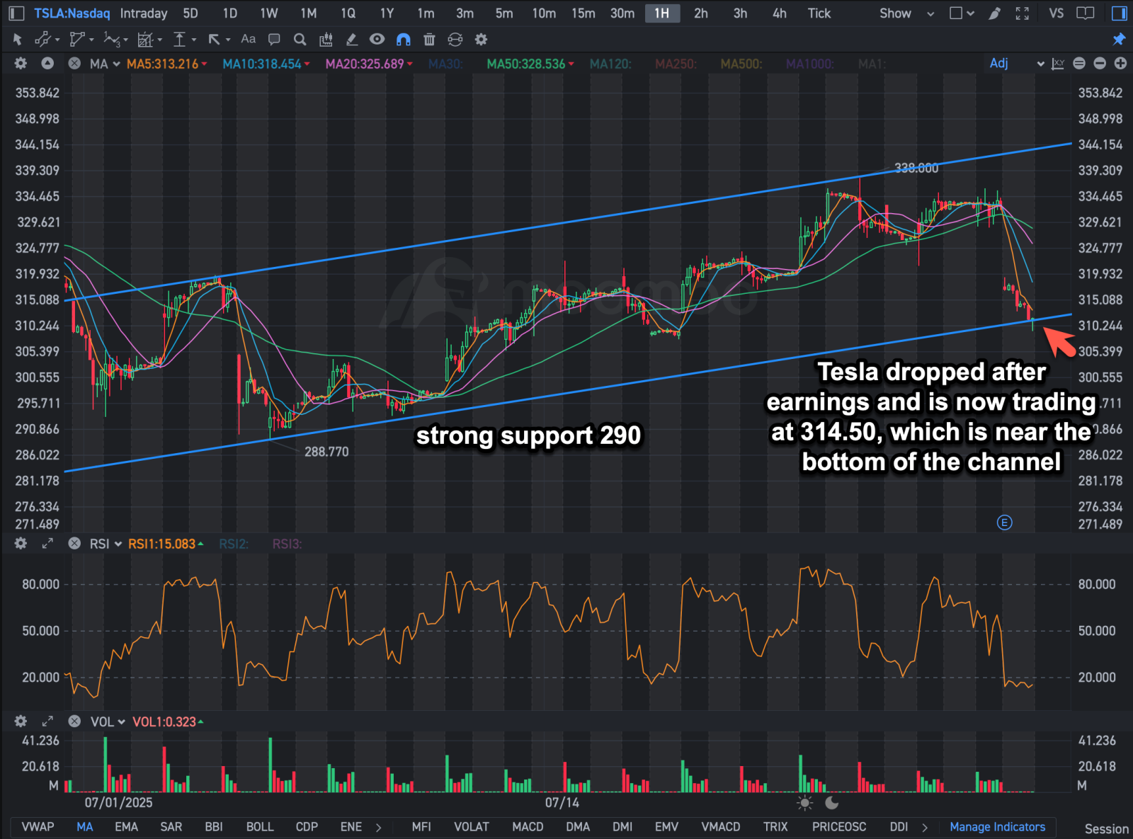 – 在業績發佈後,特斯拉的股價已經跌至大約 $311.80,測試 上升通道的下邊界爲312.