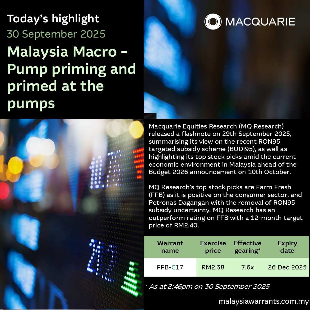 📌 Read on for an excerpt of the flashnote and to find out how you can gain leveraged exposure to FFB via structured warrants. Macquarie’s call warrant,FFB-C17目前在同類產品中絕對價格最低之一,買入/賣出價爲RM0.085/0.090。大多數FFB相關權證目前價格都在RM0.100以上: https://tinyurl.com/suwfpwha