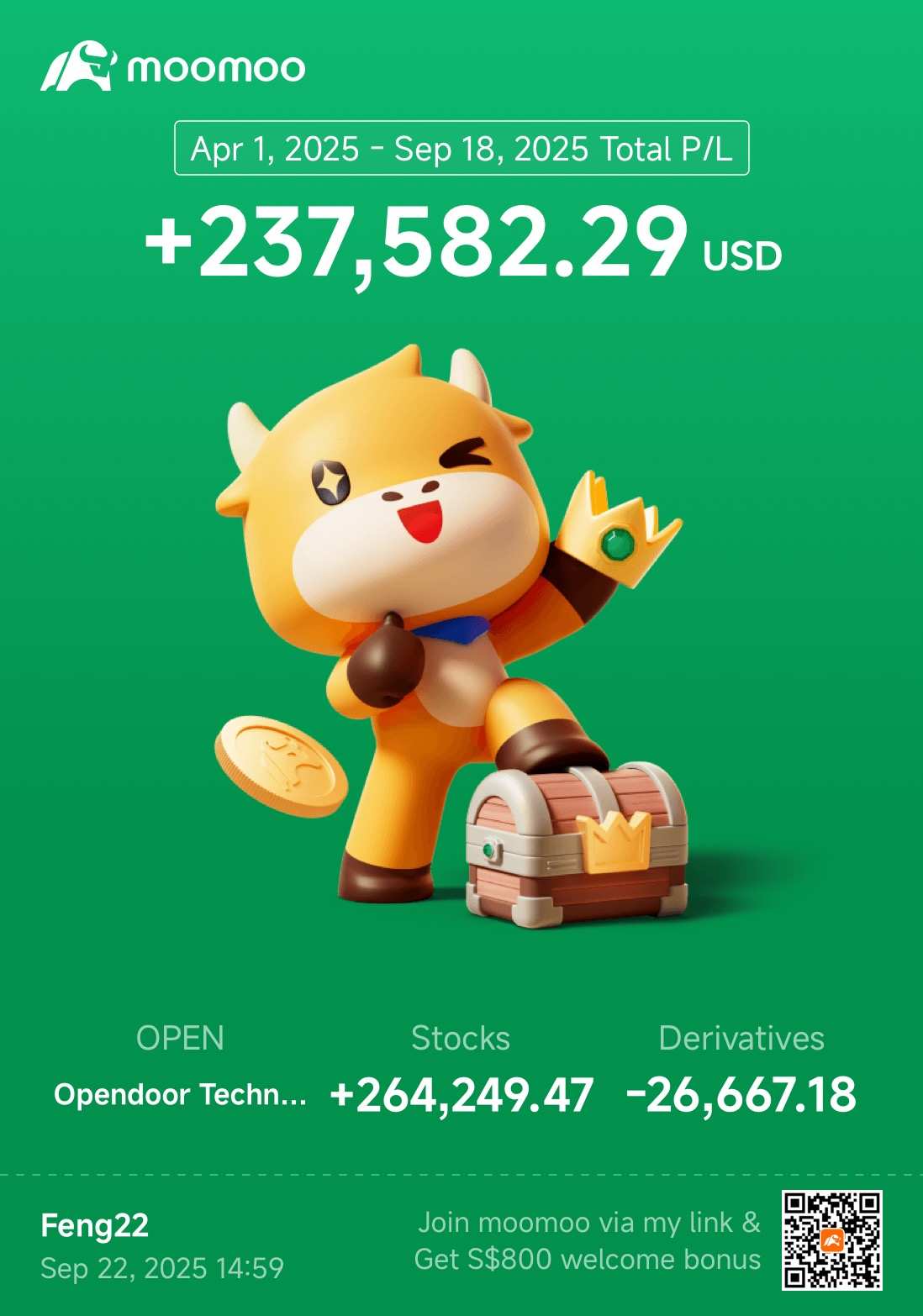Feng22 樓主 w1n : 初始資金爲10萬新加坡元,5.5個月後達到40萬新加坡元。