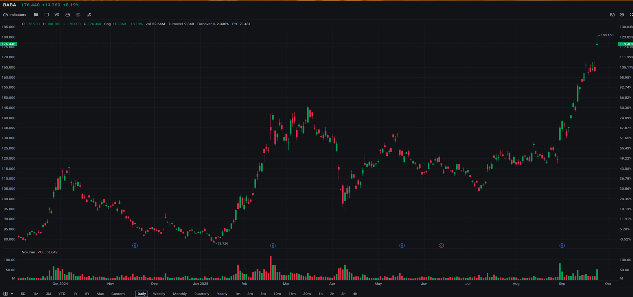 $阿里巴巴 (BABA.US)$股票上漲 8% 在推出其最大的人工智能模型Qwen3-Max,以及新的海外數據中心和與英偉達的合作之後,該股票今年幾乎翻了一番,成爲自2017年以來的最佳表現。電商業務實力增強、效率提升以及人工智能需求上升是主要原因。同時,有關創始人馬雲非正式回歸的報道也提振了市場情緒,在激烈的競爭和監管變化中增強了對公司戰略的信心。