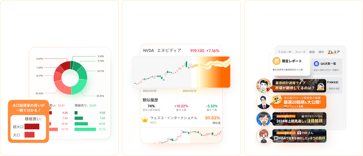 日本株の取引手数料は0円、米国株は業界最安水準(他社の約1/4)で、約6,000銘柄を24時間取引可能です。また、AIによる株価分析や大口投資家の情報も活用でき、より効率的でスマートな投資をサポートいたします。