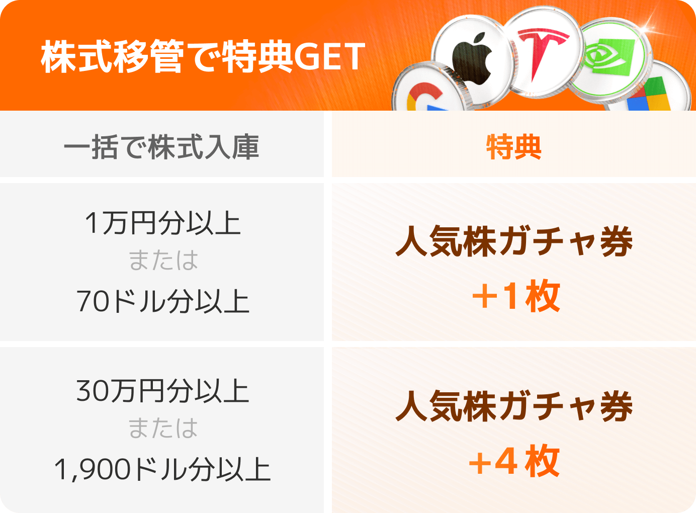 特典1:これまでに株式移管・入金を行ったことがないお客様で、かつ2025年11月1日(土)以降に初めてmoomoo証券に株式入庫を行った方