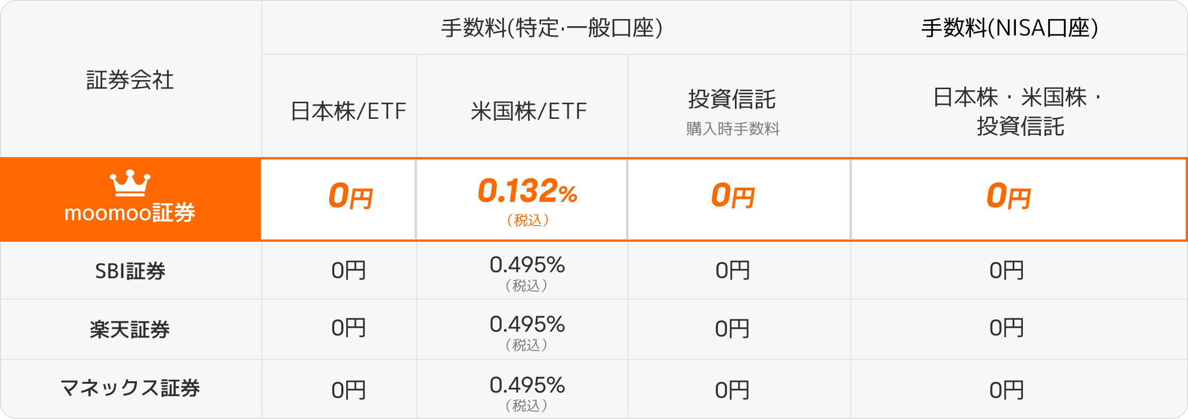 ・米国株式の取引手数料1か月間優待特典の場合、取引手数料は発生しませんが、別途現地清算費用が手数料コースによってかかる場合があります。また、為替取引の為替レートは外部業者から提供されたものを利用します。この為替レートにはスプレッドが含まれており、お客様の取引コストになります。また、moomoo証券の為替手数料については、為替手数料ページを参照ください。