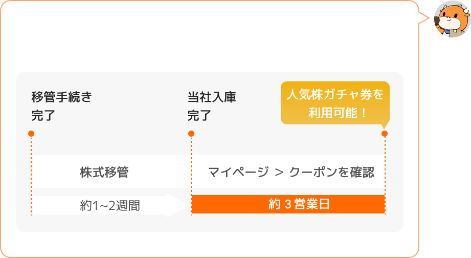1. 移管元金融機関での出庫手続きが完了してから当社で入庫手続きが完了するまで、通常約1~2週間程度のお時間がかかります。また、手続きにかかる日数は移管元金融機関によって異なるため、詳細は移管元金融機関にお問い合わせください。