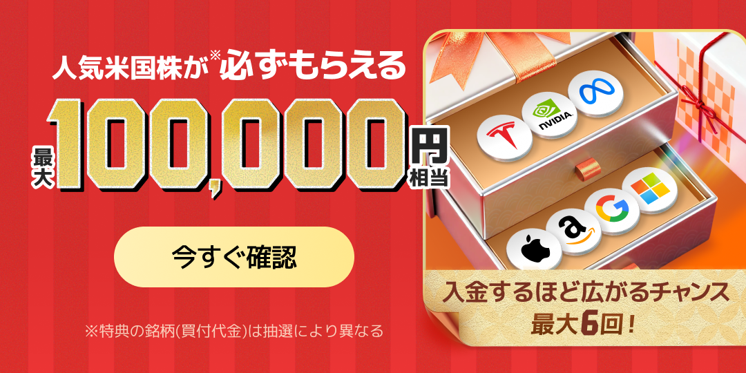 ※最大で10万円相当額が当たる人気株(買付代金)は、為替の影響などにより実際の付与額が10万円に達しない場合があります。また、抽選券4枚を使用した場合に限ります