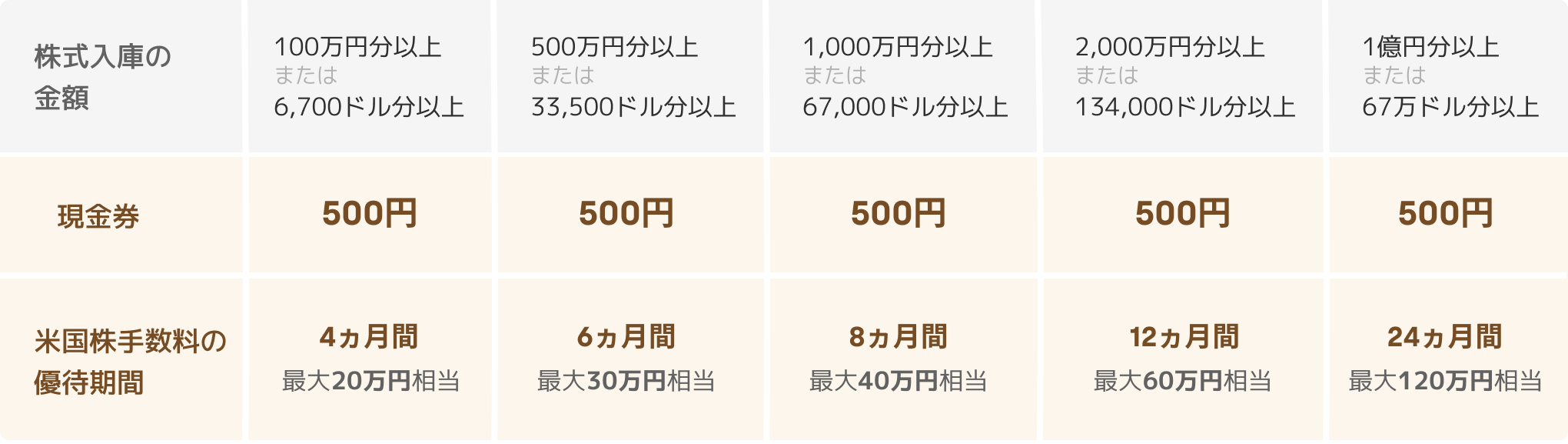 ※1億円分以上を株式入庫後に一括で発行される米国株手数料無料カードは、資産の70%以上を30日間維持するごとに4ヵ月分ずつ有効化できます。
