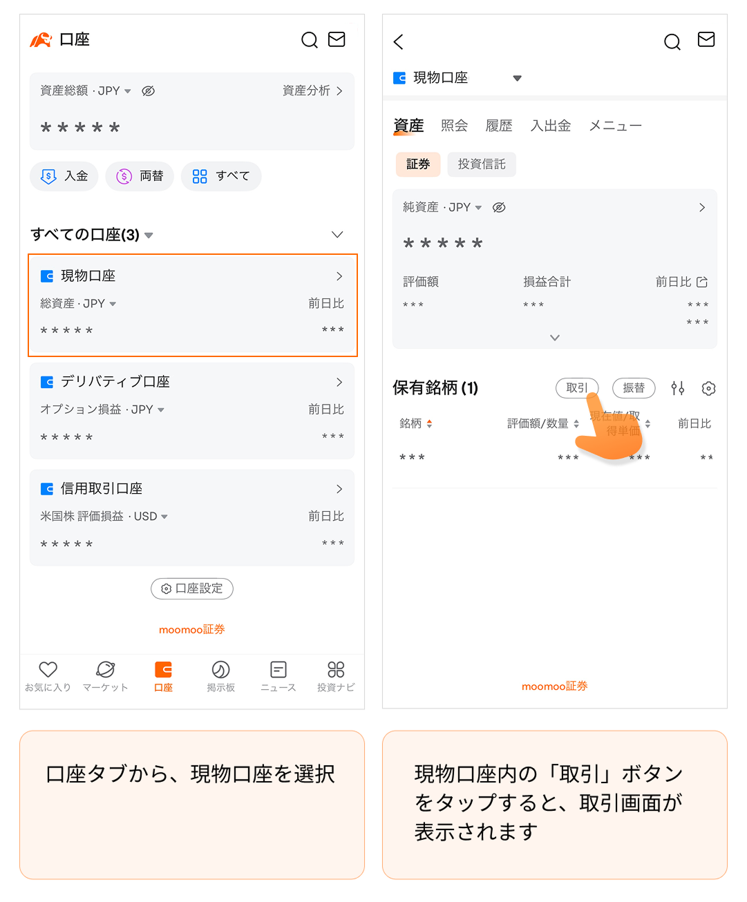 手順1:「口座タブ」 > 「現物口座」 > 「取引」