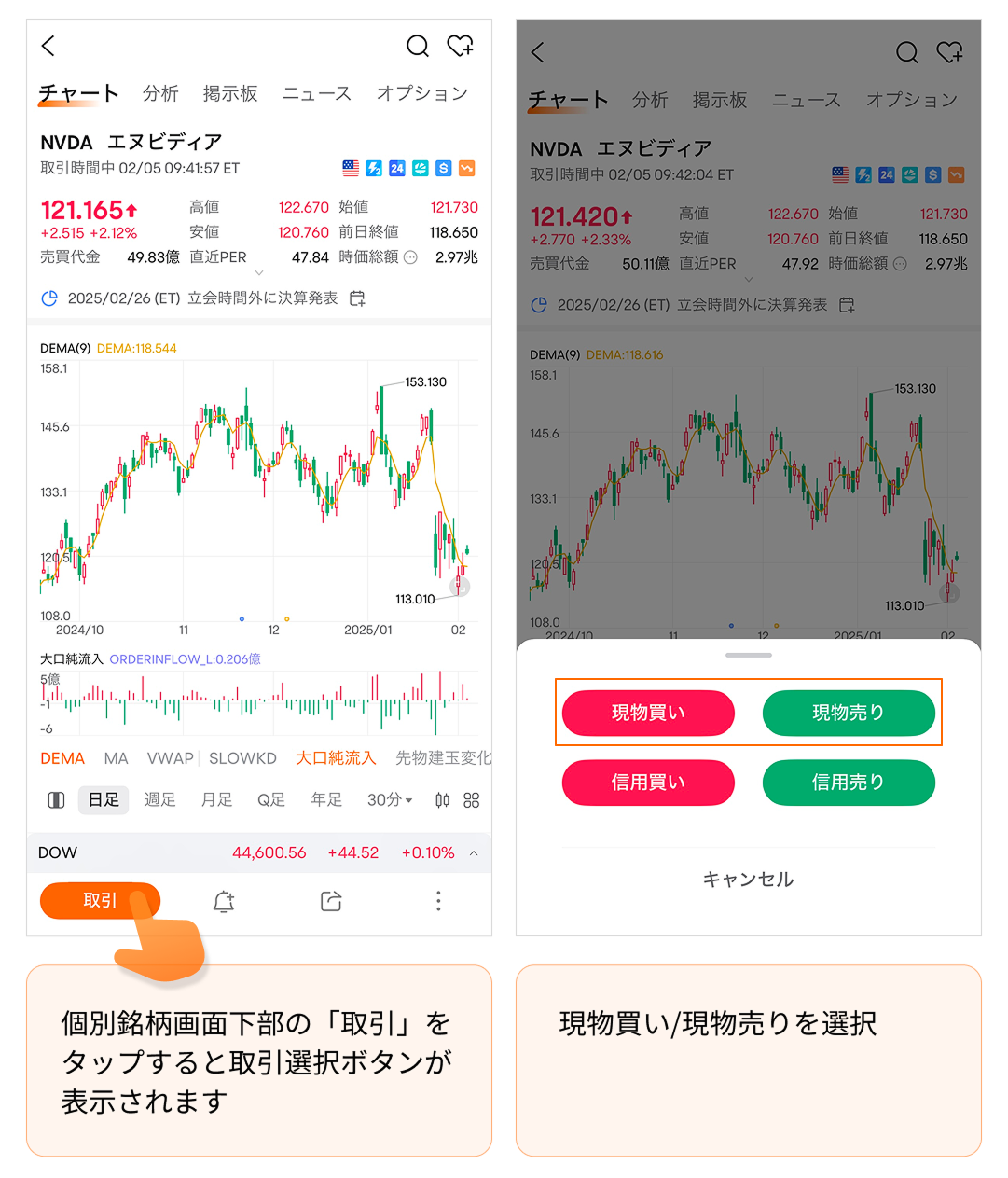 注文は、現物口座または個別銘柄の「取引」画面から、現物買い/現物売りを選択して行います。