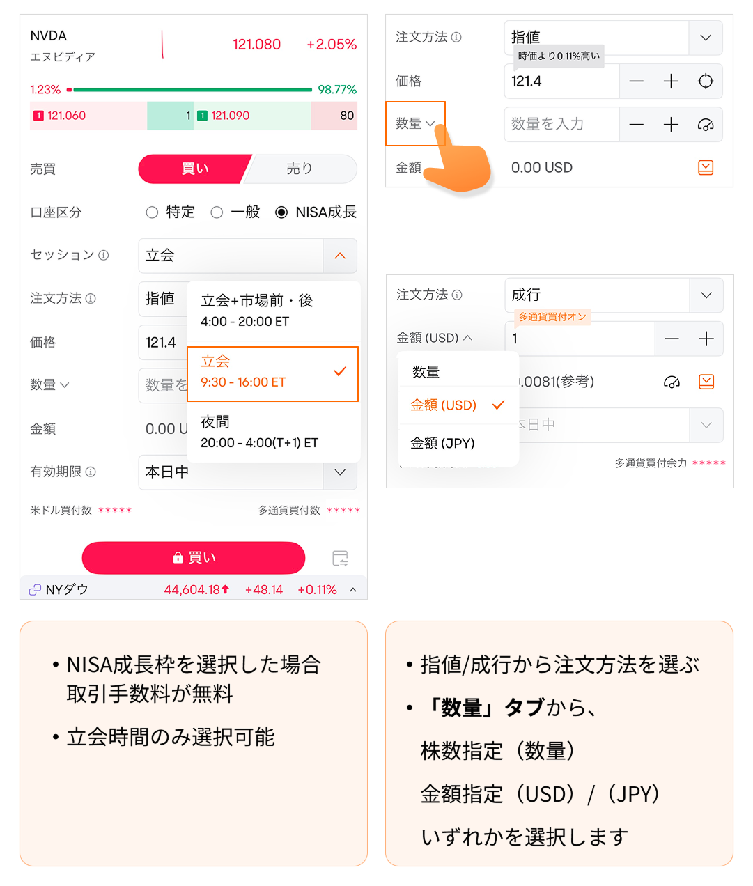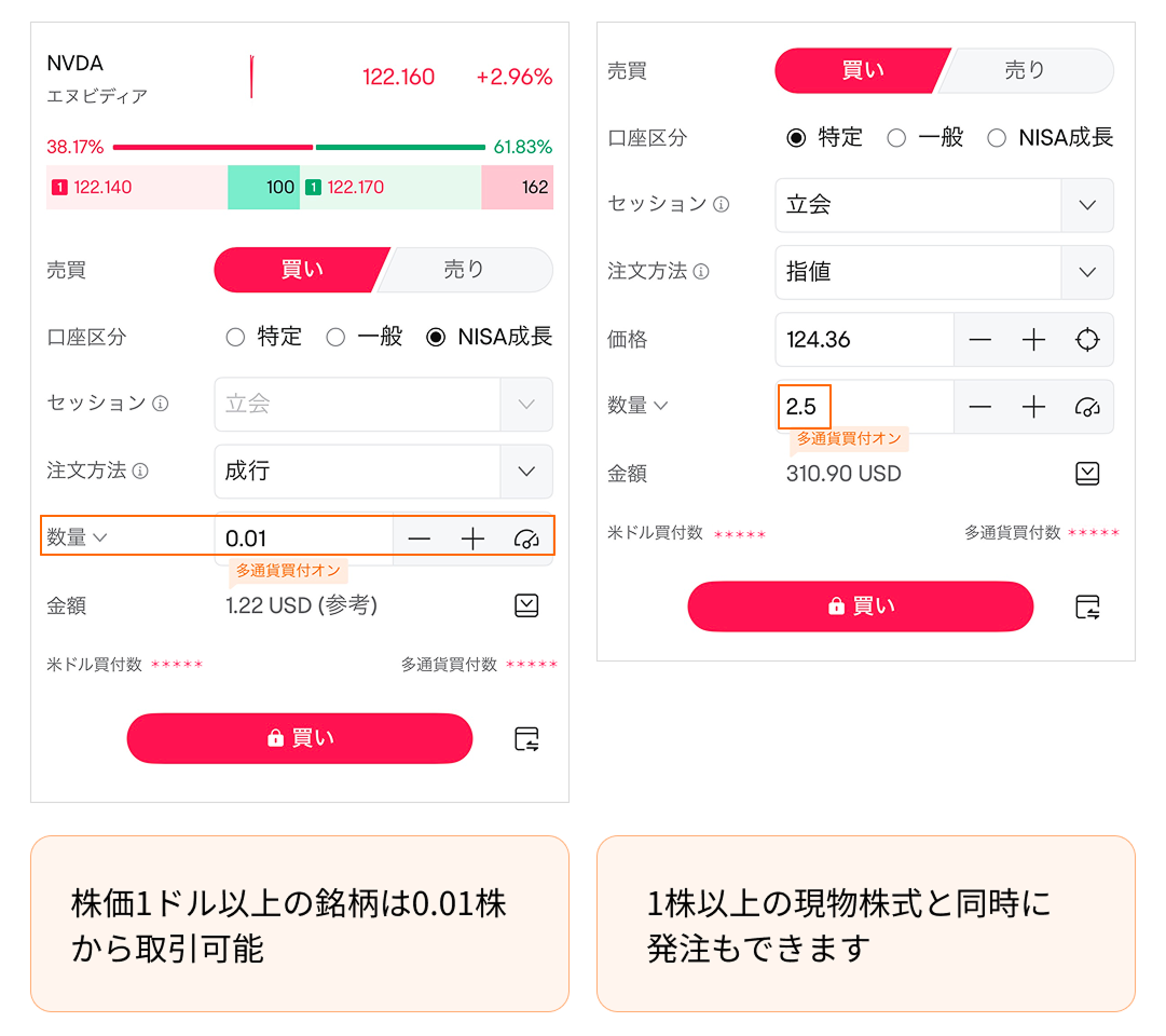 数量:株数を指定して注文を出します。0.001株単位からの取引が可能であり、買付/売却金額はその時点の株価に基づいて自動で計算されます。1株以上の現物株式と同時に発注も可能です。