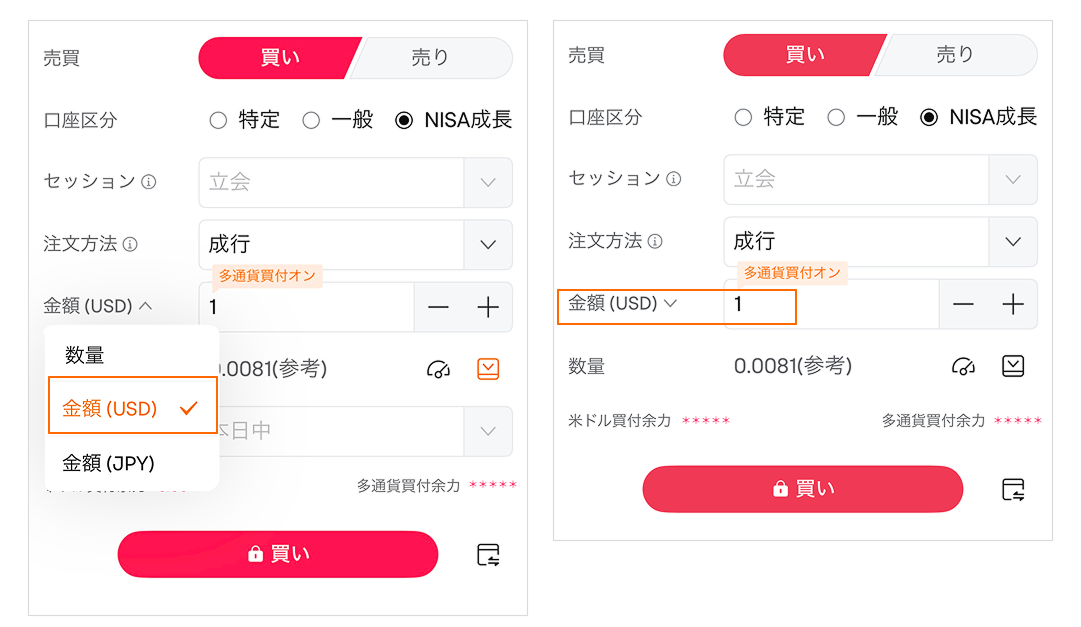 数量タブをタップし、数量指定(株数)、金額指定(USD)/(JPY)のいずれかを選択します。