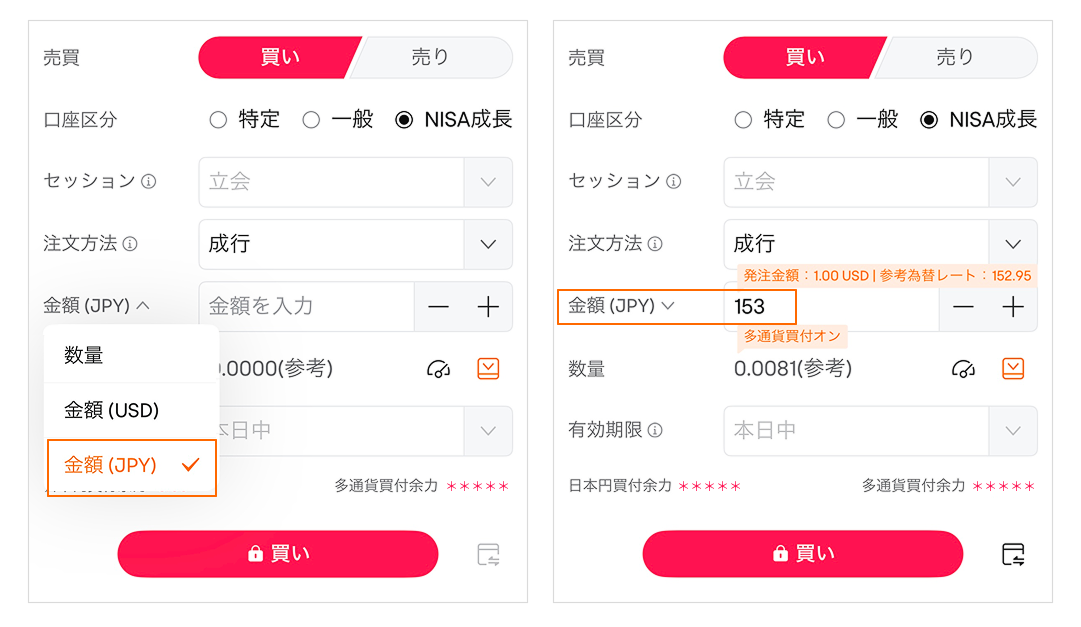 日本円を選択する場合:買付は1ドル相当金額の日本円からであり、指定した金額に基づいて自動的に買付可能な株数が計算されます。なお、金額指定での売却注文発注は不可となっています。