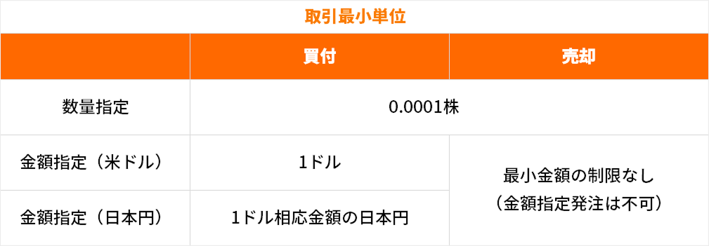 米ドルを選択する場合:買付は1ドルからであり、指定した金額に基づいて自動的に買付可能な株数が計算されます。なお、金額指定での売却注文発注は不可となっています。