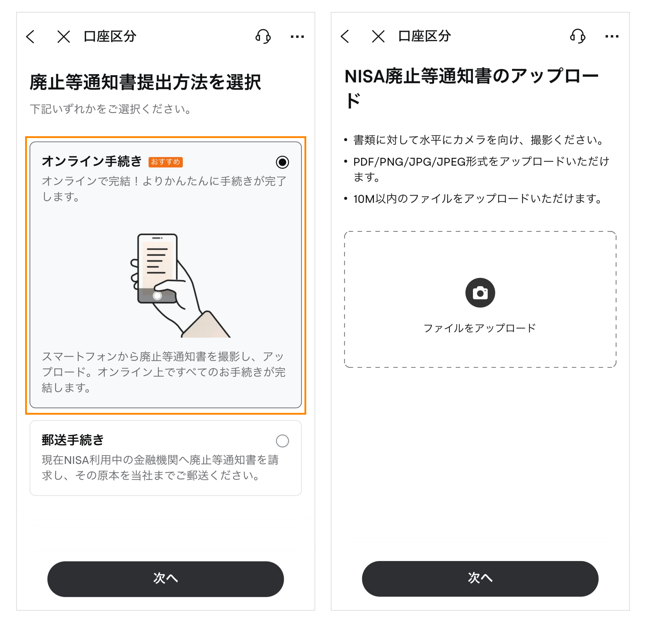 勘定廃止通知書か、非課税口座廃止通知書のいずれかをスマートフォンで撮影し、画像をアップロードします。