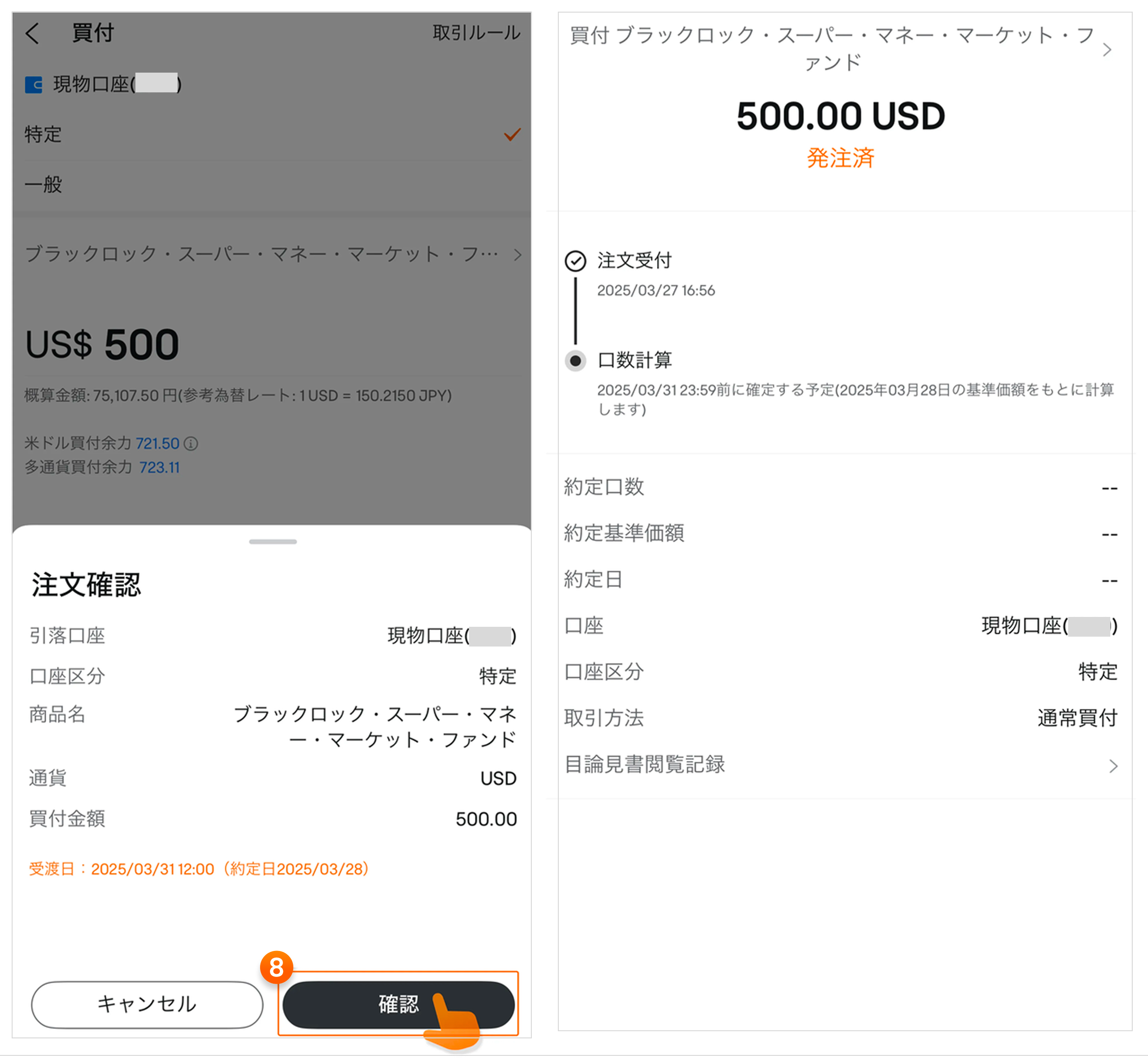 入力内容に間違いがないかを確認後、「確認」ボタンをタップして買付注文完了となります。