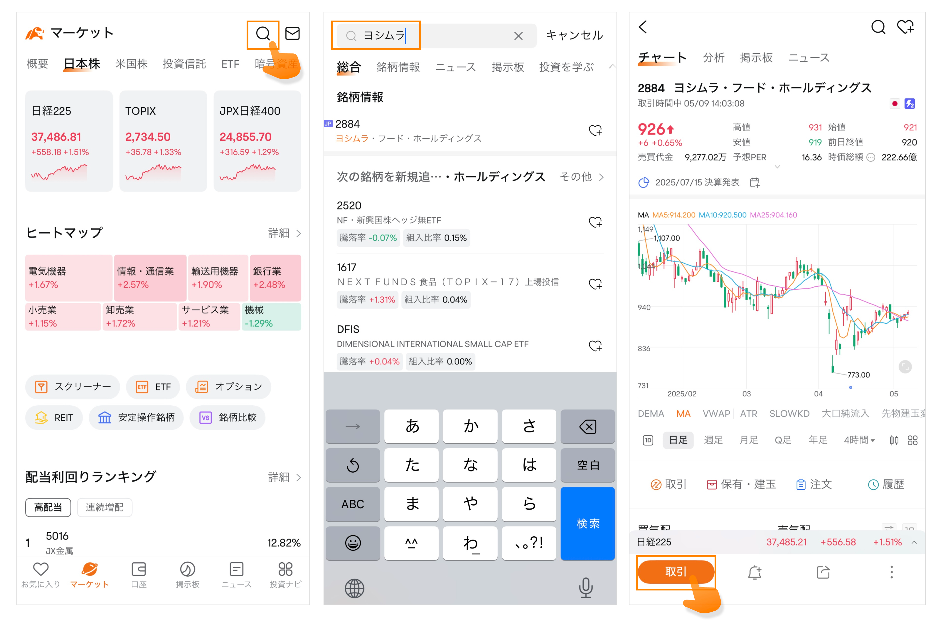 アプリ画面右上の「🔍」検索から銘柄名またはコードを入力し、表示された銘柄詳細画面で「取引」をタップします。