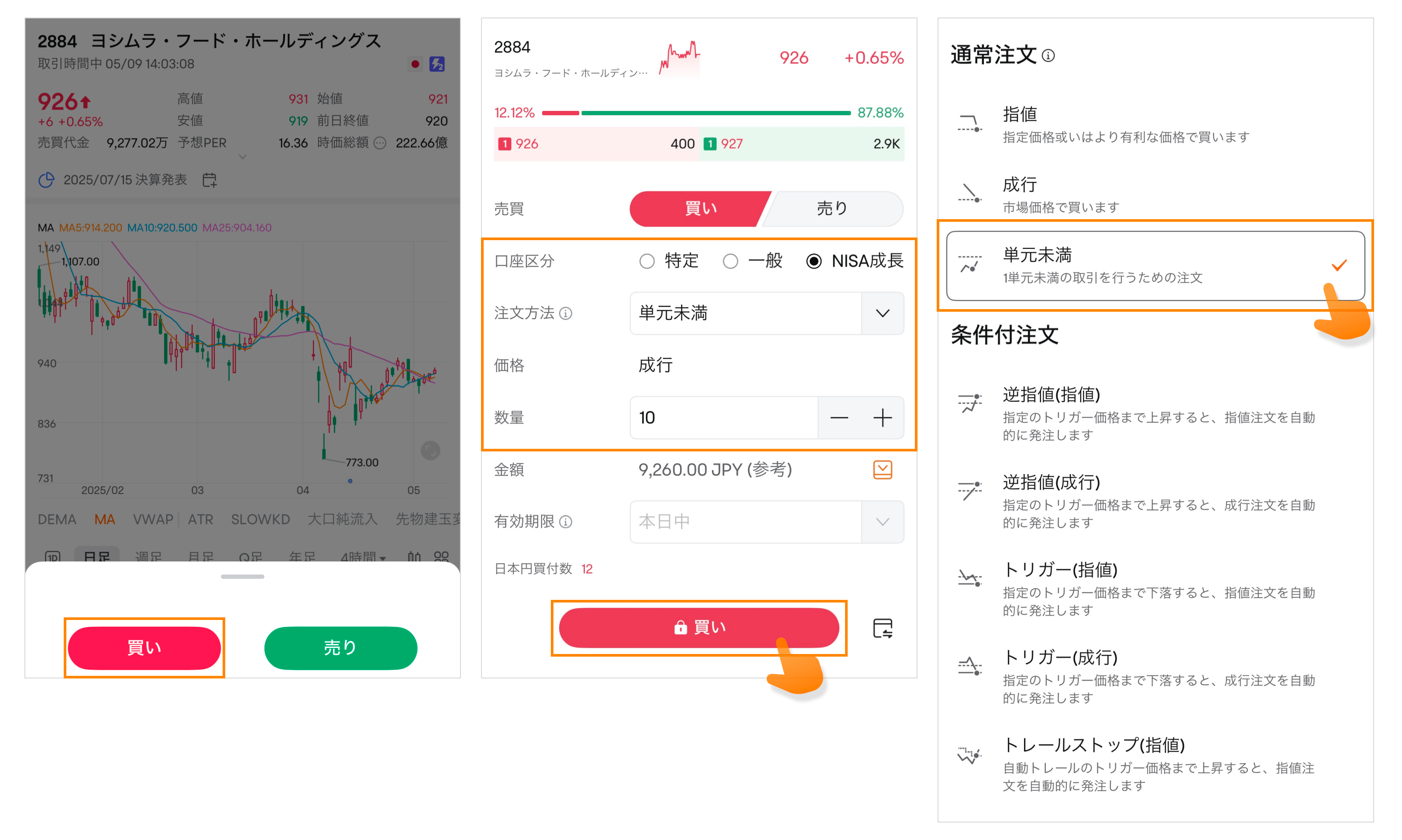 「買い」をタップし、取引画面の 「注文方法」から、「単元未満」を選択します。