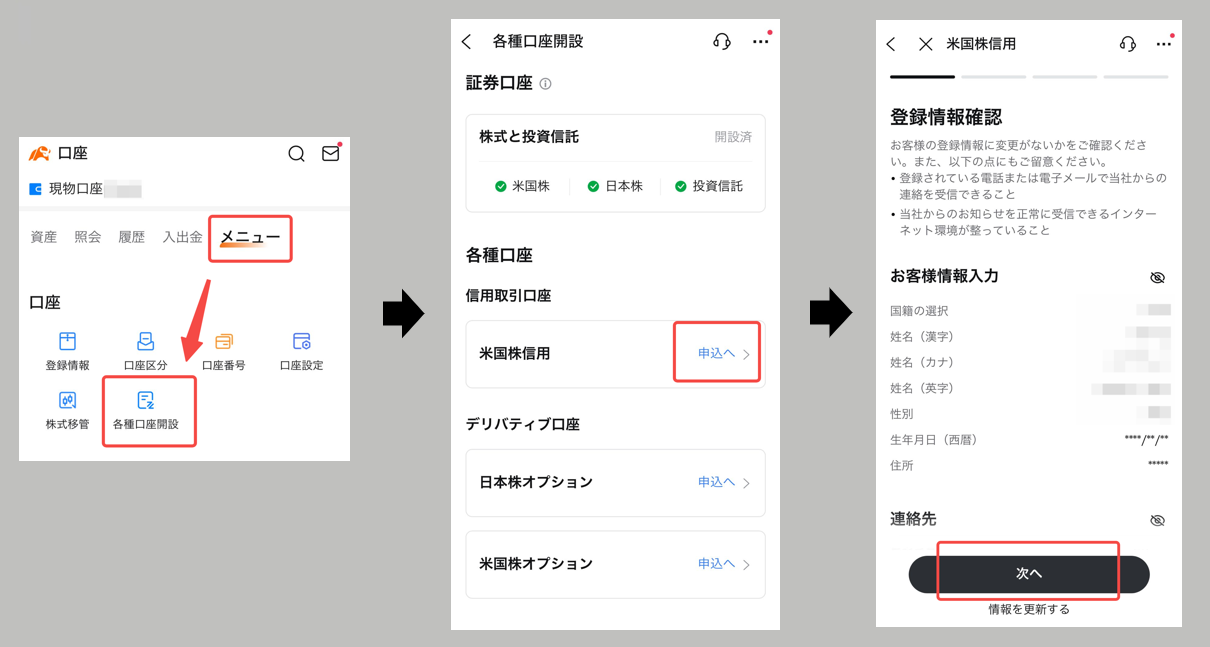 米国株の信用取引を始めるには、米国株信用取引口座を開設する必要があります。アプリより「口座>メニュー>各種口座開設」の「各種口座>米国株信用取引口座」からお申込みいただけます。