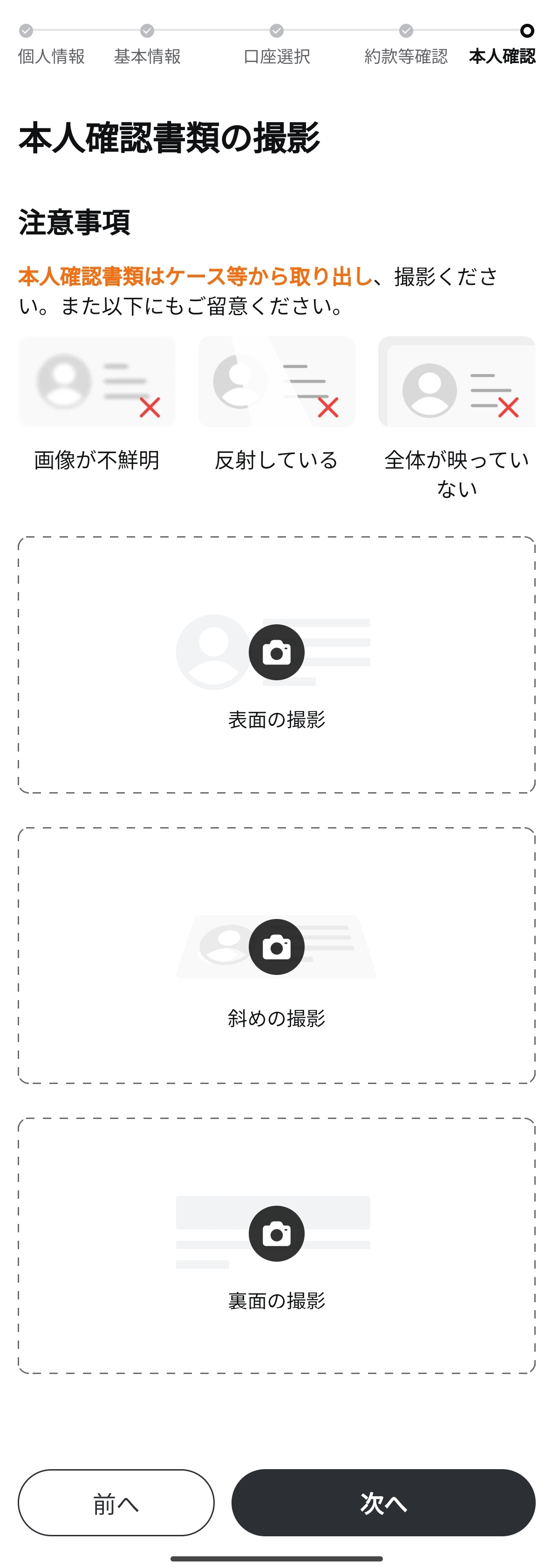 基本情報を入力し、本人確認書類や顔写真を撮影する必要があります。