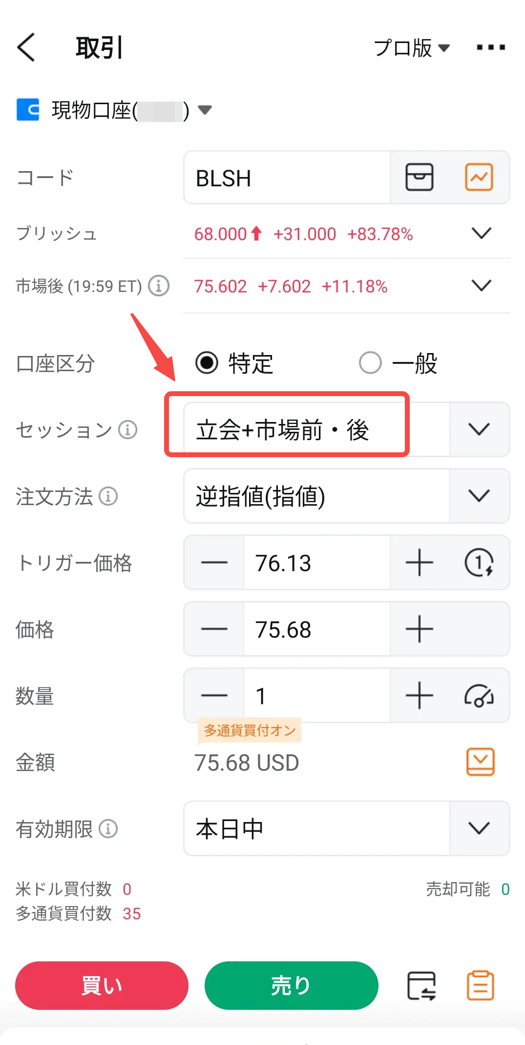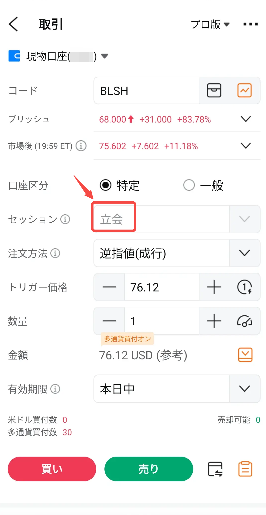 上場日当日は夜間取引に対応できません。そのため、指値、逆指値(指値)の注文の場合、「立会時間+市場前後」または「立会」のセッションを指定してください。成行、逆指値(成行)の注文の場合は「立会」のセッションを指定してください。