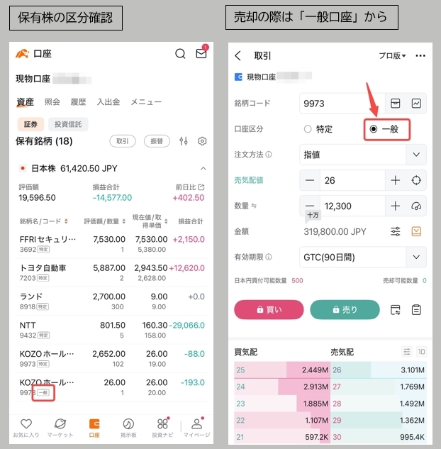 ※抽選で入手したボーナス株を売る際、口座区分は必ず「一般」を選択いただくようお願いします。