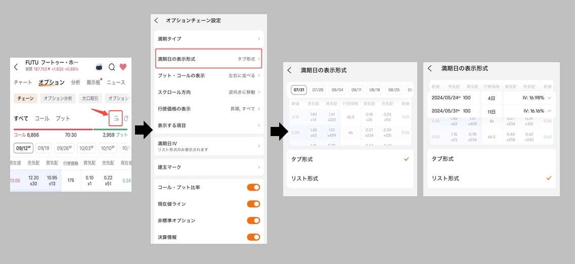 満期日の表示形式の切り替えは、オプションチェーン設定アイコンから「満期日の表示形式」にお進みいただくことで設定可能です。