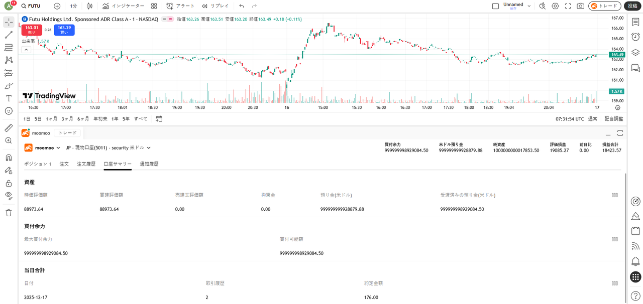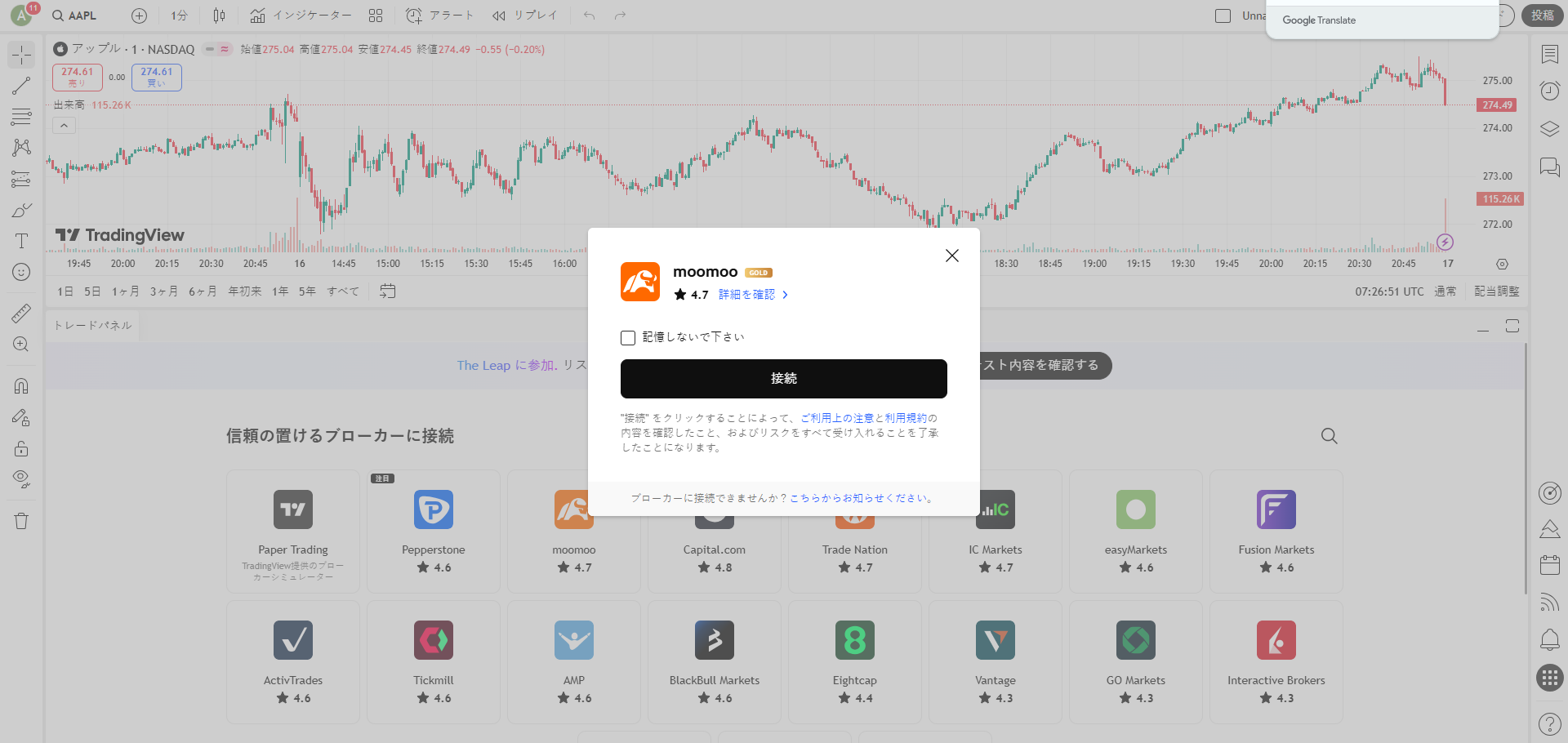 まずTradingViewとmoomoo証券の口座を接続してください。
