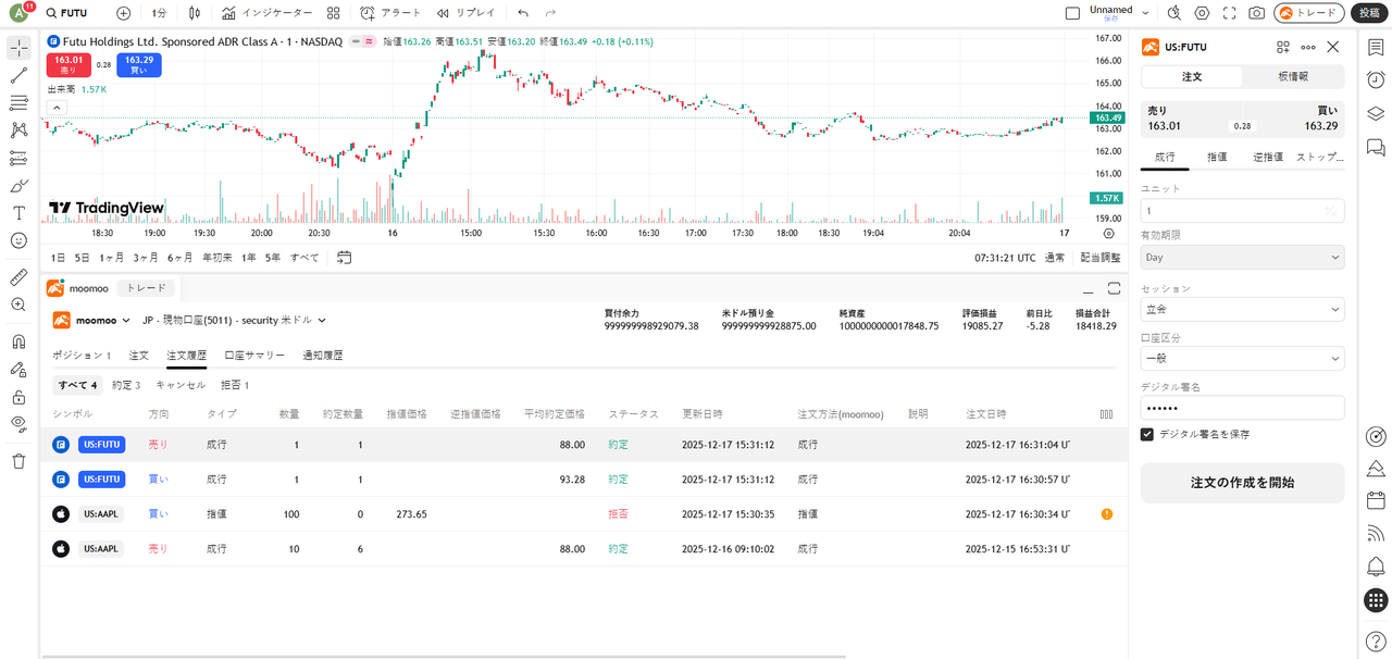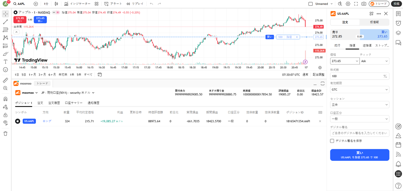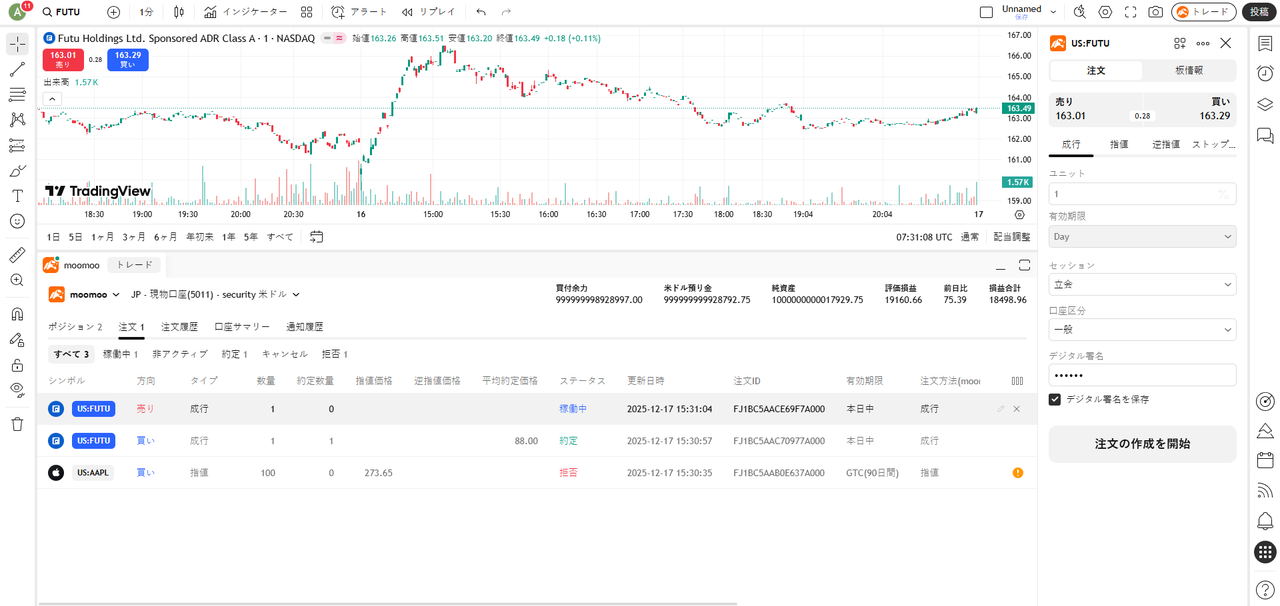- TradingViewの注文名称と定義は、moomoo証券のものと異なる可能性があります。moomoo証券で発注された注文をTradingViewで確認する際は、moomoo証券の注文名称を基準にしてください。なお、TradingViewでは、moomoo証券の口座で発注された注文の表示、訂正、取消に対応できない可能性があります。