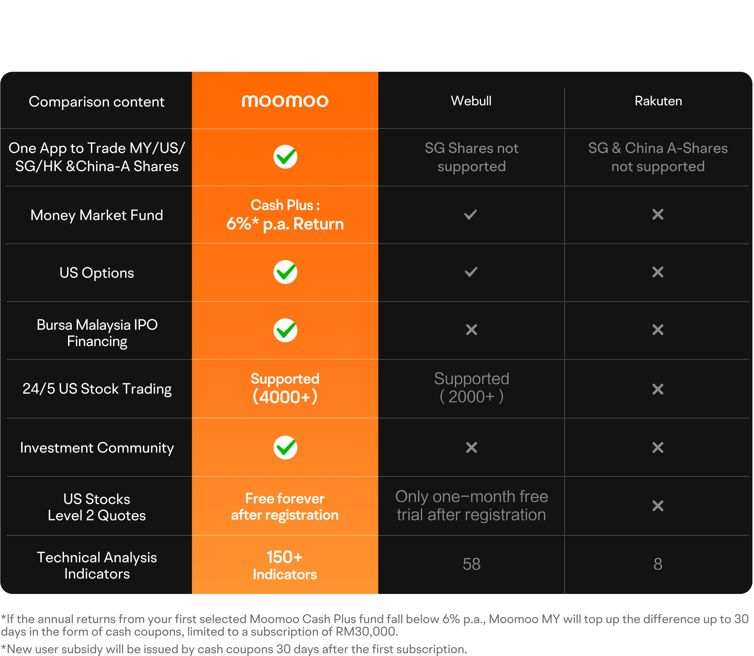 7.In Malaysia, the investment products available through the Moomoo app are offered by Moomoo MY, a licensed entity registered with Securities Commission Malaysia (SC) (License No. eCMSL/A0397/2024). The Moomoo App is a trading platform provided by Moomoo Technologies Inc. Nothing in connection with this Campaign/Promotion shall be construed as an offer, invitation or recommendation to buy or sell securities, futures or other investment products. Moomoo MY does not provide investment advice and does not recommend any securities or transactions. All types of investments involve risk, and you may suffer losses. All information and data on the webpage are for informational purposes only. Past performance is no guarantee of future results. This Campaign/Promotion does not consider your investment objectives, financial situation or financial needs.