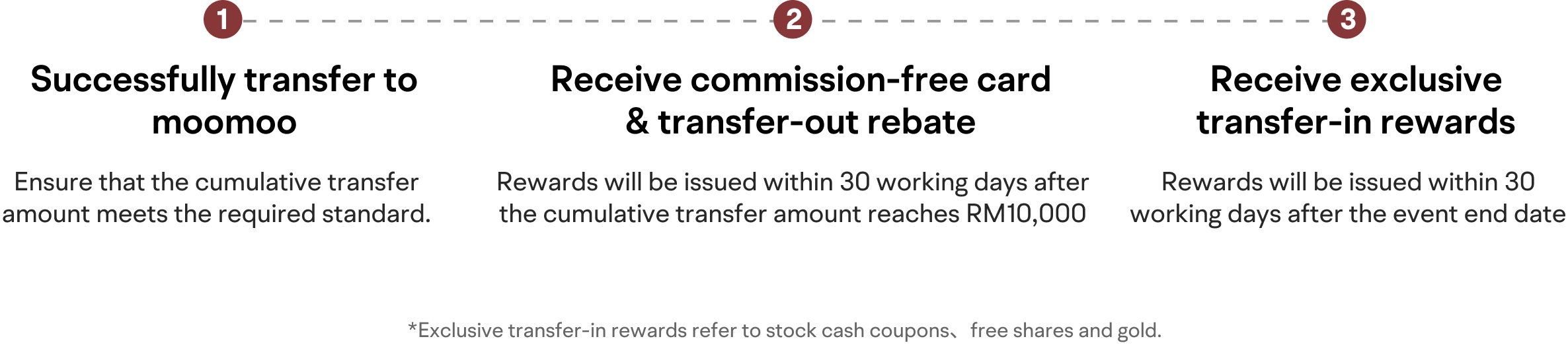 After the successful transfer, the free shares and the stock cash coupon rewards will be reflected in your account within 30 working days after the event end date 31/12/2025. The eligibility to claim the gold reward will be granted to your account within 30 working days after reaching the cumulative transfer amount of RM800,000. The rewards can be viewed in [moomoo APP - Me - My Rewards]. However, the reward issued at this time is in a frozen state. You need to keep the asset limit corresponding to the reward for at least 90 days after receiving reward(s) to unfreeze. Otherwise, the action will be deemed ineligible for the award. Rewards will be automatically unfrozen into your account.