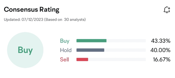 This section displays the combined rating from selected analysts along with a horizontal histogram showing the proportion of each specific rating.The overall rating, as well as each specific rating, is derived from the rating data for the past three months. To set up an alert for any changes in the overall rating, tap the bell icon located in the upper right corner. This will allow you to receive a push notification when the overall rating is updated.