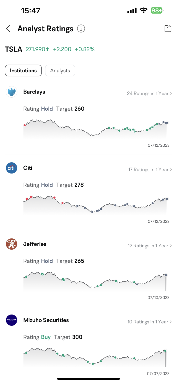 Tap the trend chart under a specific institution, and you will be taken to a page displaying all past ratings by the institution for the target stock.