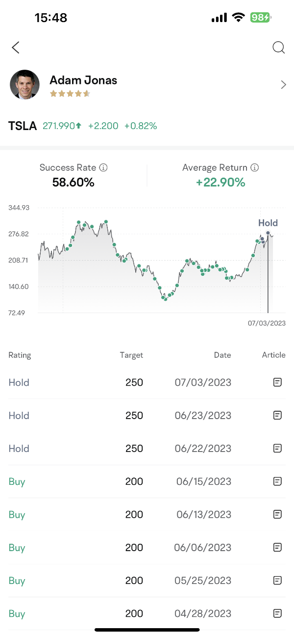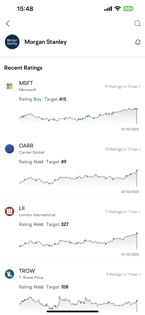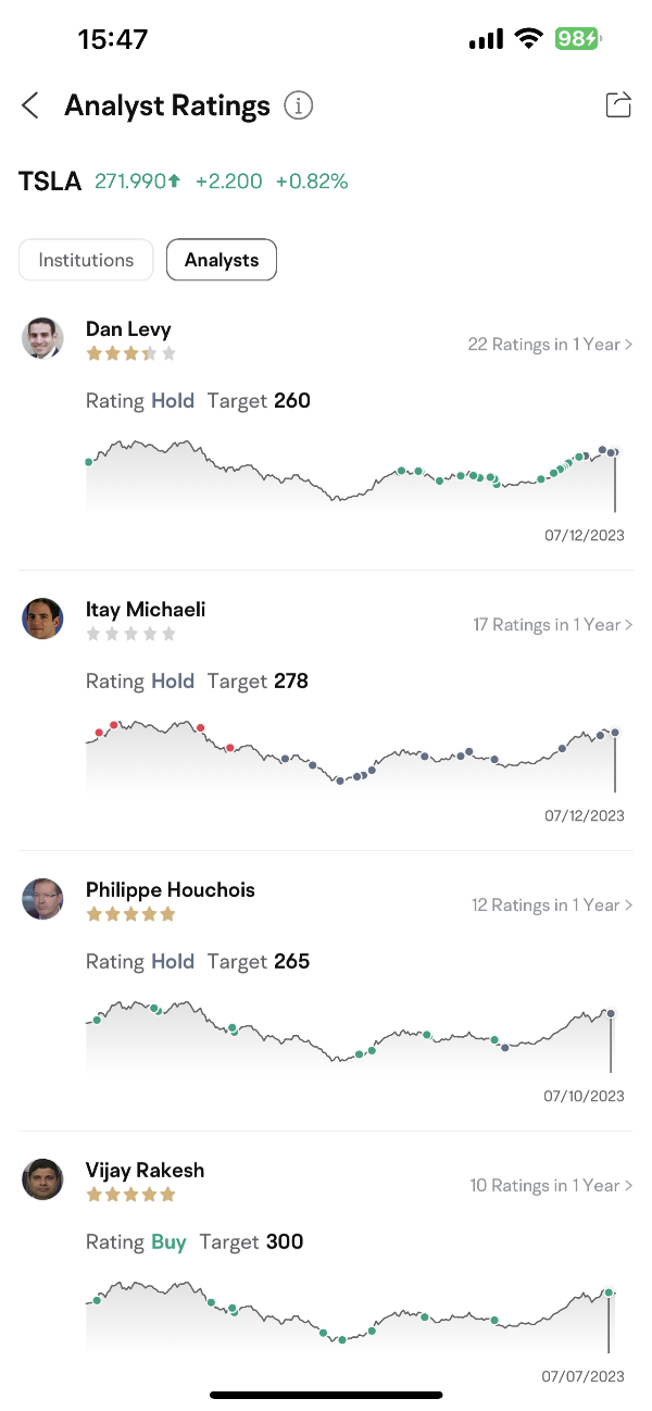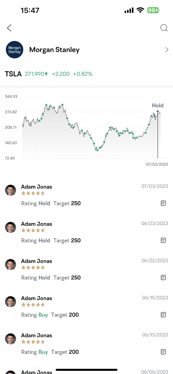 Tap the trend chart under a specific analyst, and you will be taken to the page displaying all past ratings by the analyst for the target stock.