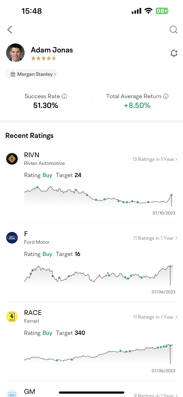 Tap the profile photo or the name of a specific analyst, and you will be taken to the page displaying the latest ratings by the analyst for all stocks that he/she has rated in the past.