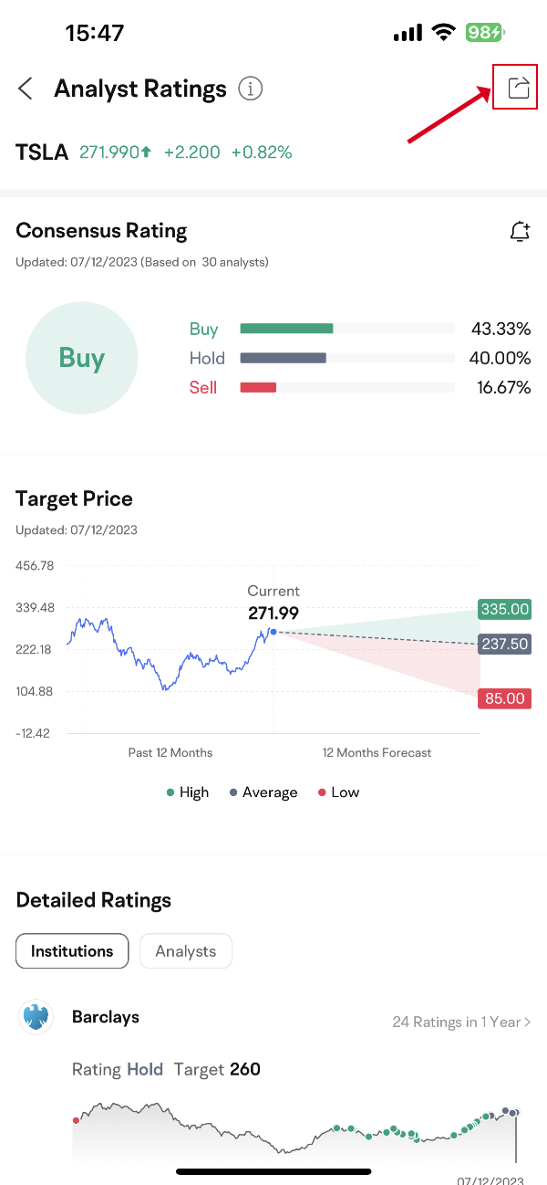 Tap the share icon in the upper right corner of the homepage of this feature, and you can share the information on this page with your friend. You can choose to take a screenshot or create a long image. In particular, a long image contains the whole page, i.e. Consensus Rating, Target Price, and Detailed View (including five new subsections).