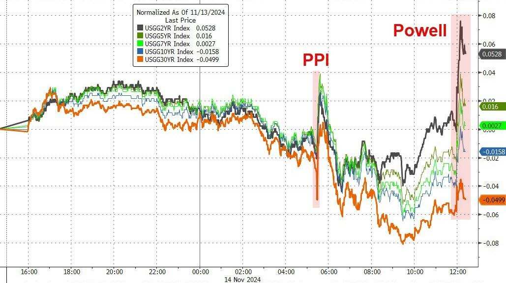 Most maturities of US Treasury yields rose after Powell's speech overnight, especially short-term yields surged, with the 2-year Treasury yield rebounding 8 basis points to 4.36% at one point.
