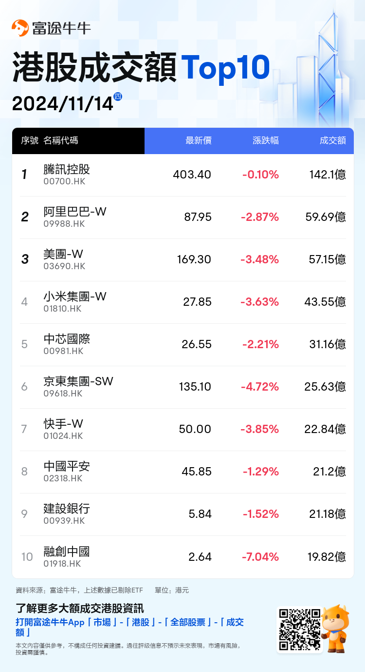 In terms of individual stocks, $CTG DUTY-FREE (01880.HK)$ Fell nearly 5%, third-quarter core financial data under pressure, institutions are bullish on the recovery of duty-free at ports after the opening of outbound tourism.