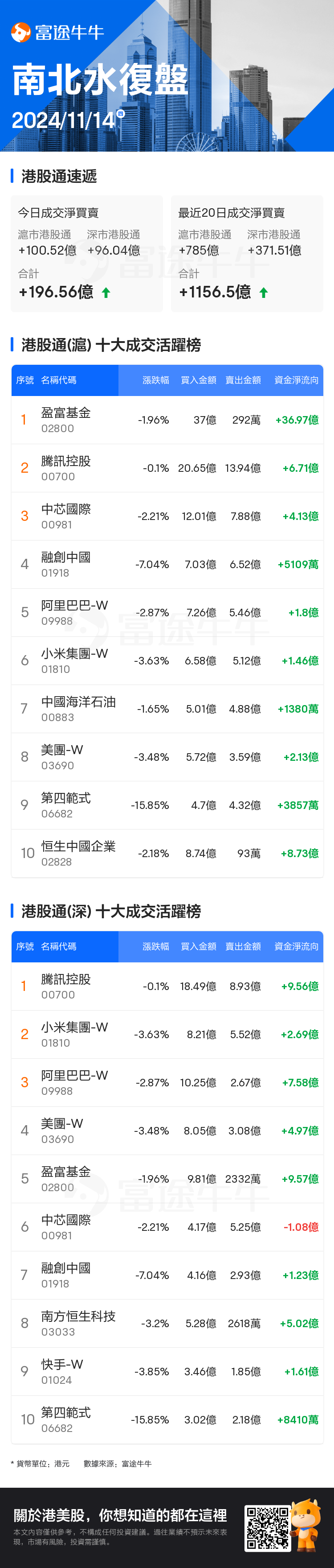 On November 14 (Thursday), southbound capital net bought 19.656 billion HKD of Hong Kong stocks today.