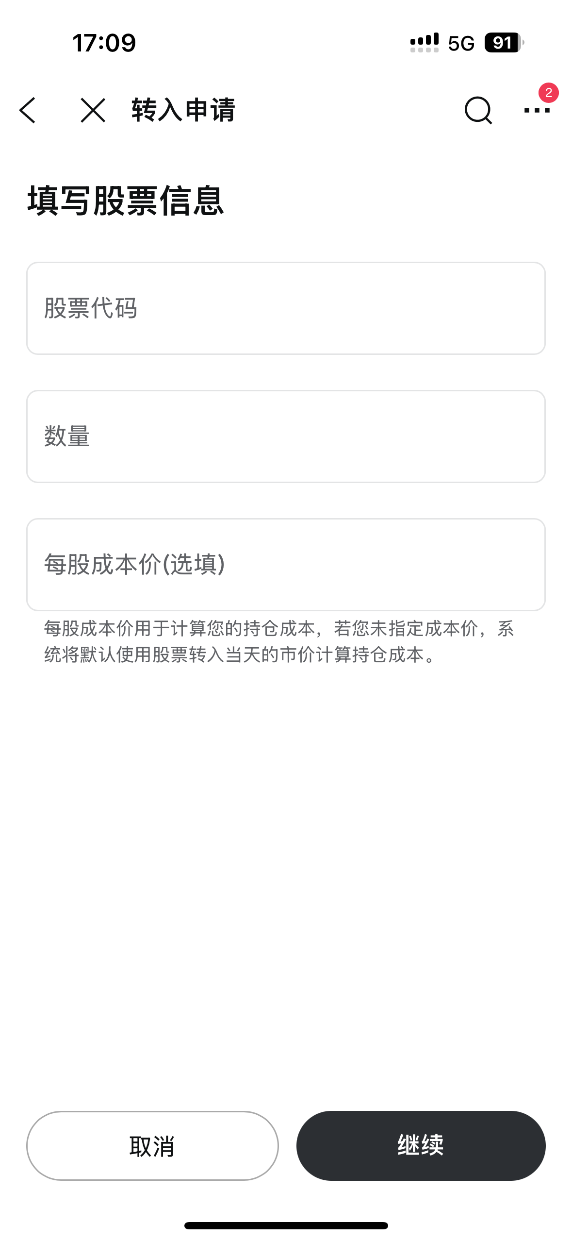 请根据页面提示填写转仓信息(股票代码、数量、成本价等),确认无误后,进入下一步。