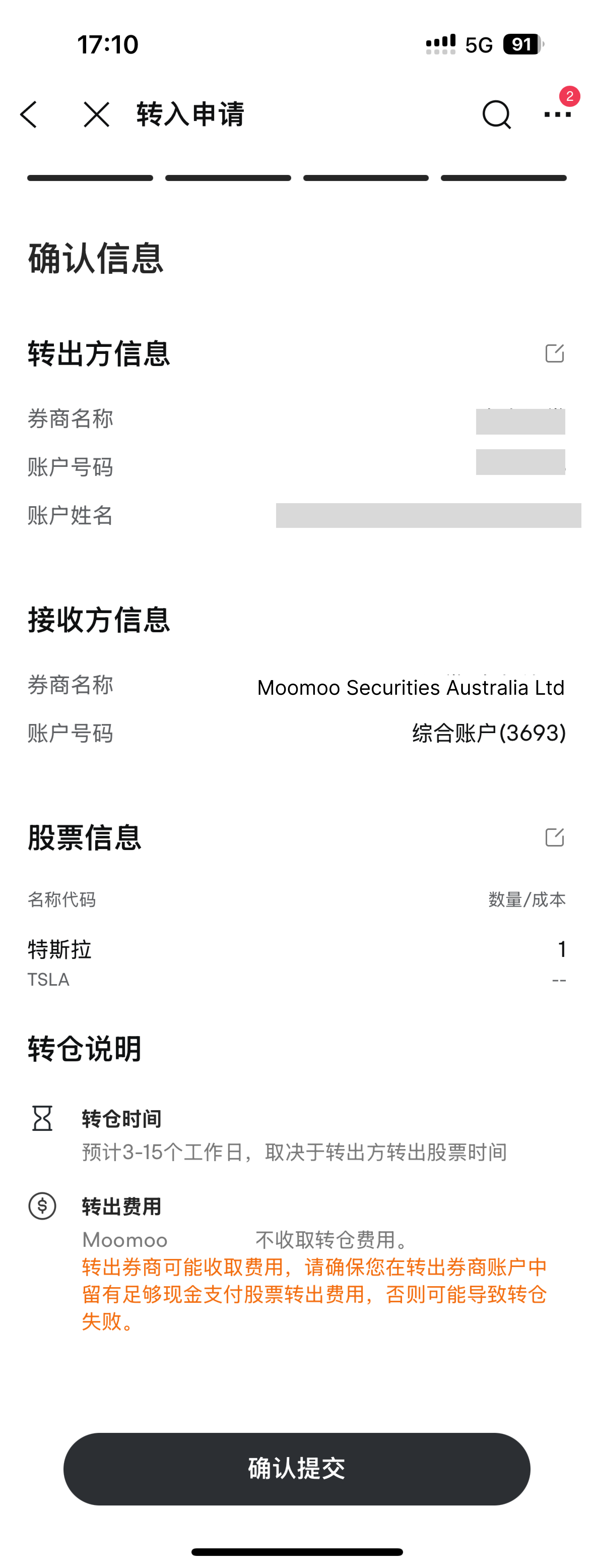 请核对转出券商、股票代码、股数的信息,确认无误后提交指示。如填写错误或漏填,可返回修改。