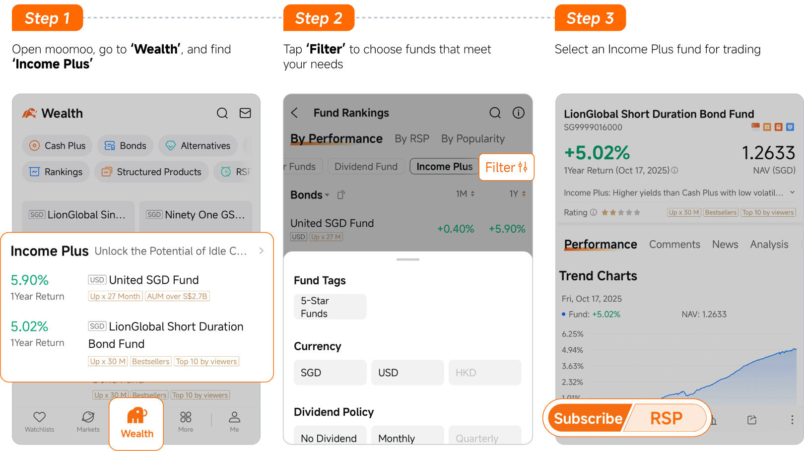 1. Open the Moomoo app -> Register or log in a Moomoo SG universal account -> Wealth tab -> Click on the Income Plus module/filter "Income Plus" in the fund ranking -> Enter the Income Plus fund details page -> Open a Moomoo SG Universal Account (if not already opened) -> Select the account and purchase amount -> Confirm and submit the subscription-> Track the investment performance