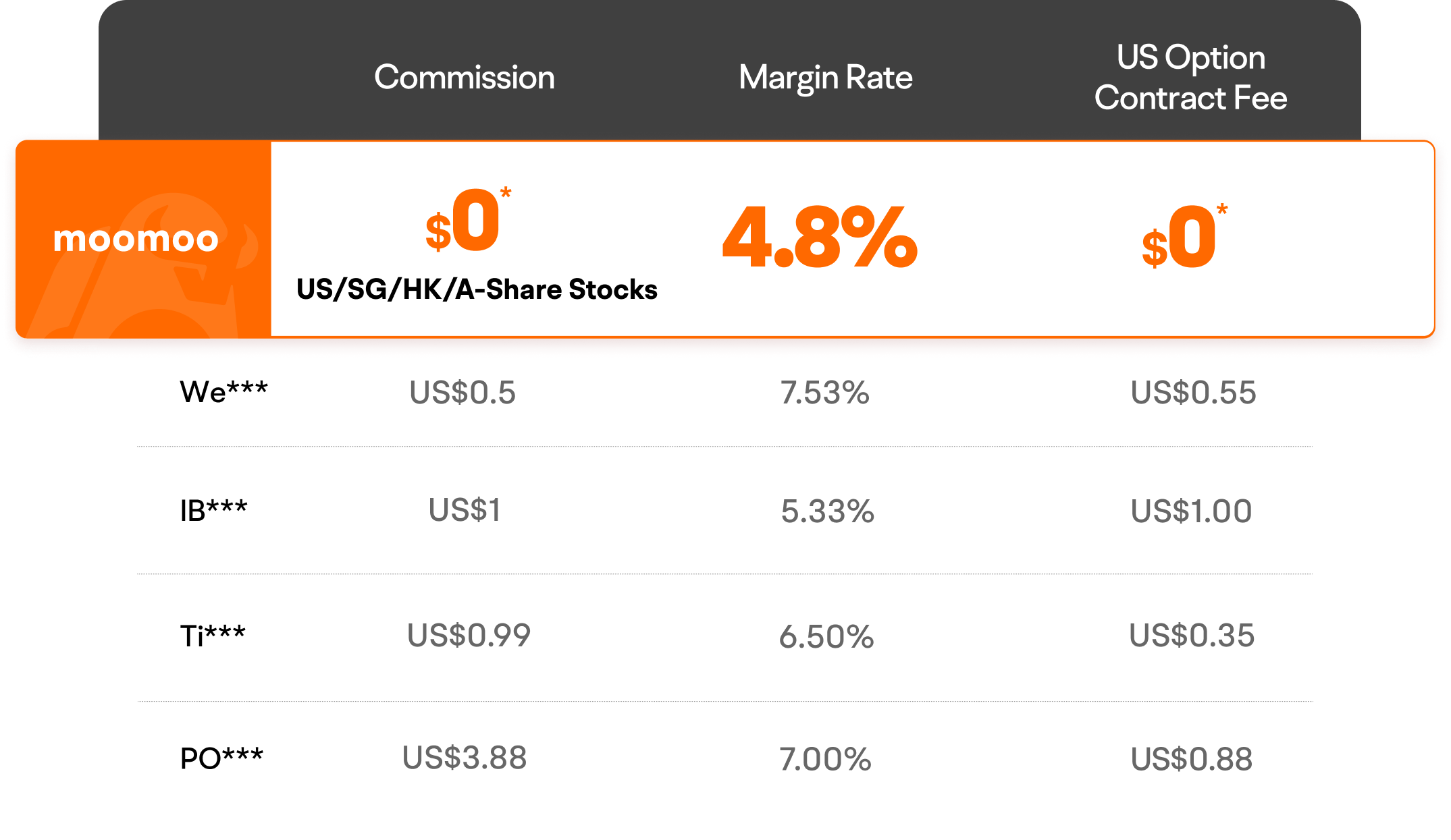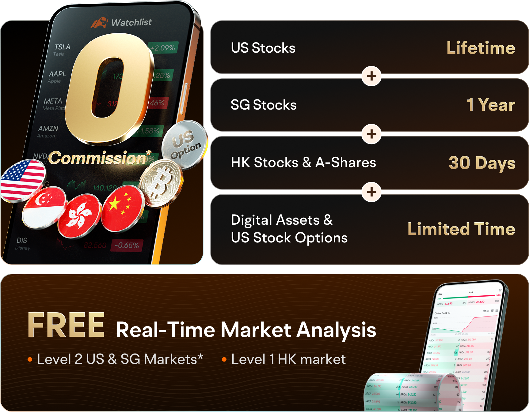 - $0* commission for US, SG, HK, and CN Stocks